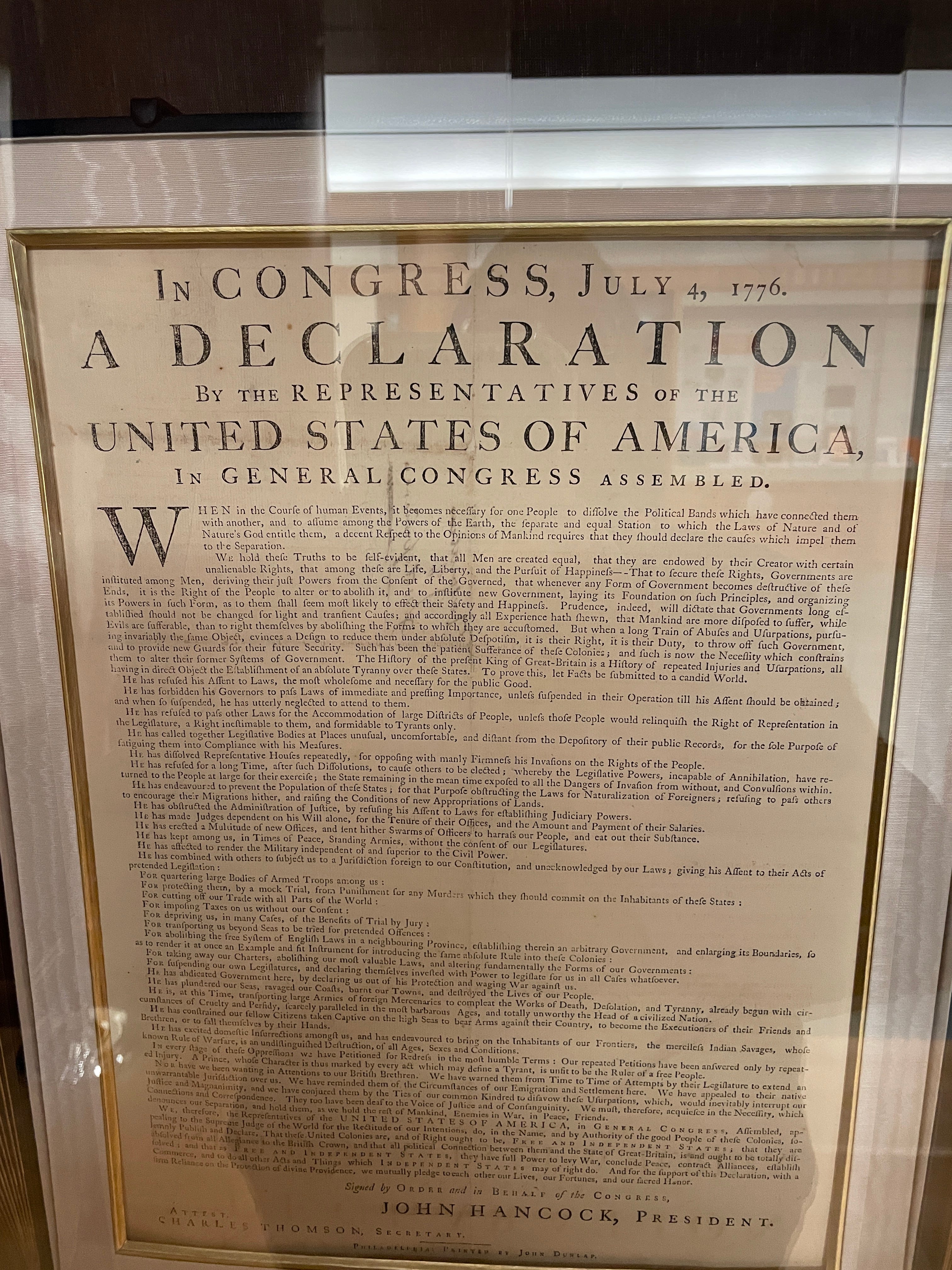 (Unique Dunlap Broadside printed on parchment, in the vault of the American Philosophical Society. Photo by author (hence the reflection).)