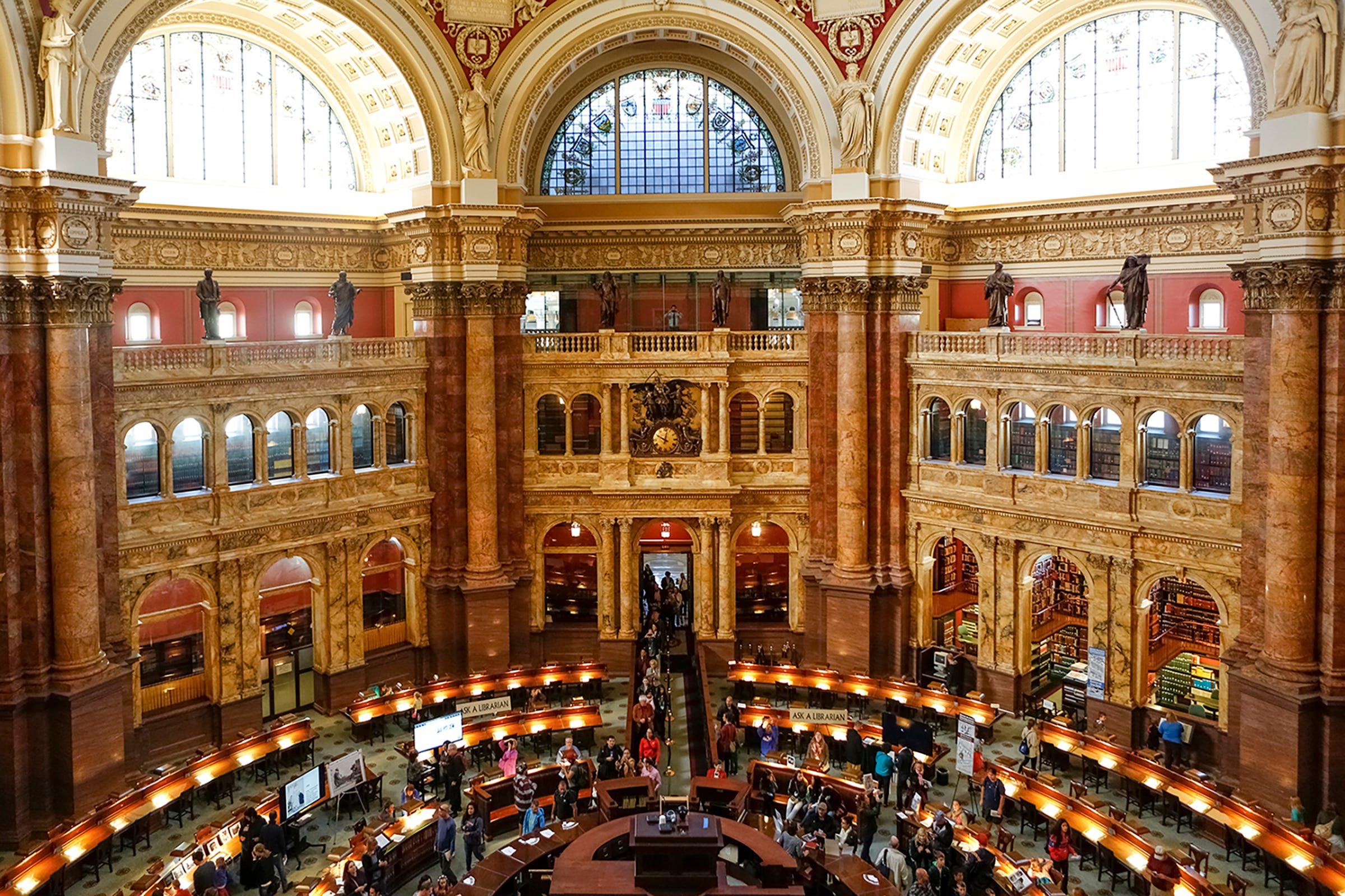 But the Main Reading Room, though the spiritual center of the Library, is just the beginning. There are subject matter reading rooms spread throughout all three main buildings, from the American Folklife Center in the basement of the main Jefferson Building, to the Science and Business Reading Room, in the overlooked Adams Building, which is a magnificent Art Deco room originally dedicated to Thomas Jefferson and filled with murals and quotes from the drafter of the Declaration of Independence. The Manuscript Division (in the massive Madison Building) holds 78 million items alone, and it and the Rare Book and Special Collections Division are a veritable treasure storehouse. Then there are the Recorded Sound and Moving Picture divisions, Prints and Photographs, Newspapers and Periodicals divisions, the restoration and preservation laboratories, and on and on. And almost everything, unless truly fragile or priceless, can be requested to read, watch, or listen.